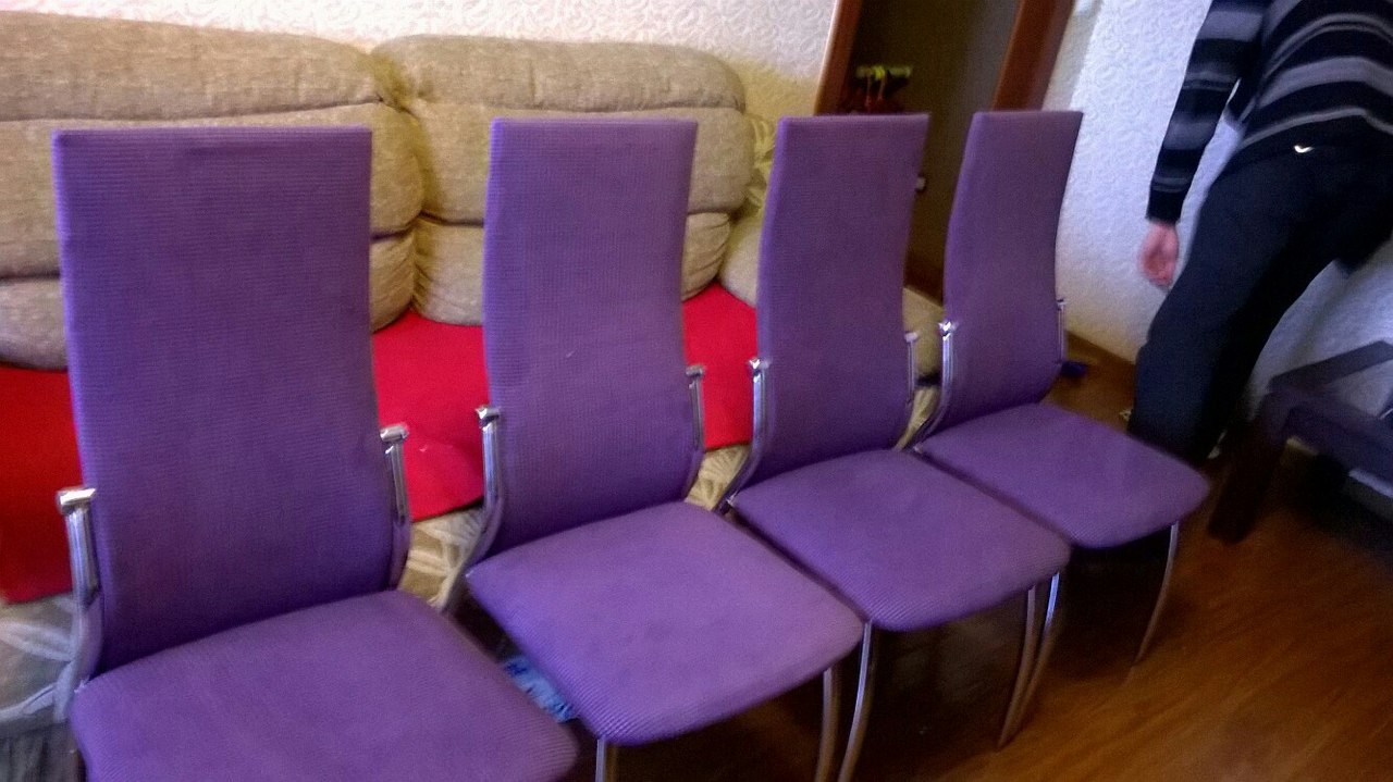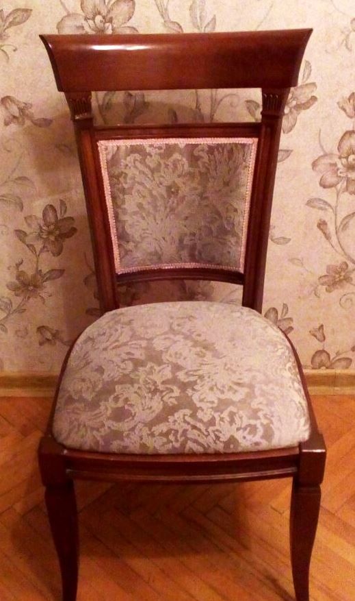 Описание работ: Перетянули жаккардовой тканью 8 стульев, сделали профилактику наполнителя, выполнили склейку и ремонт.